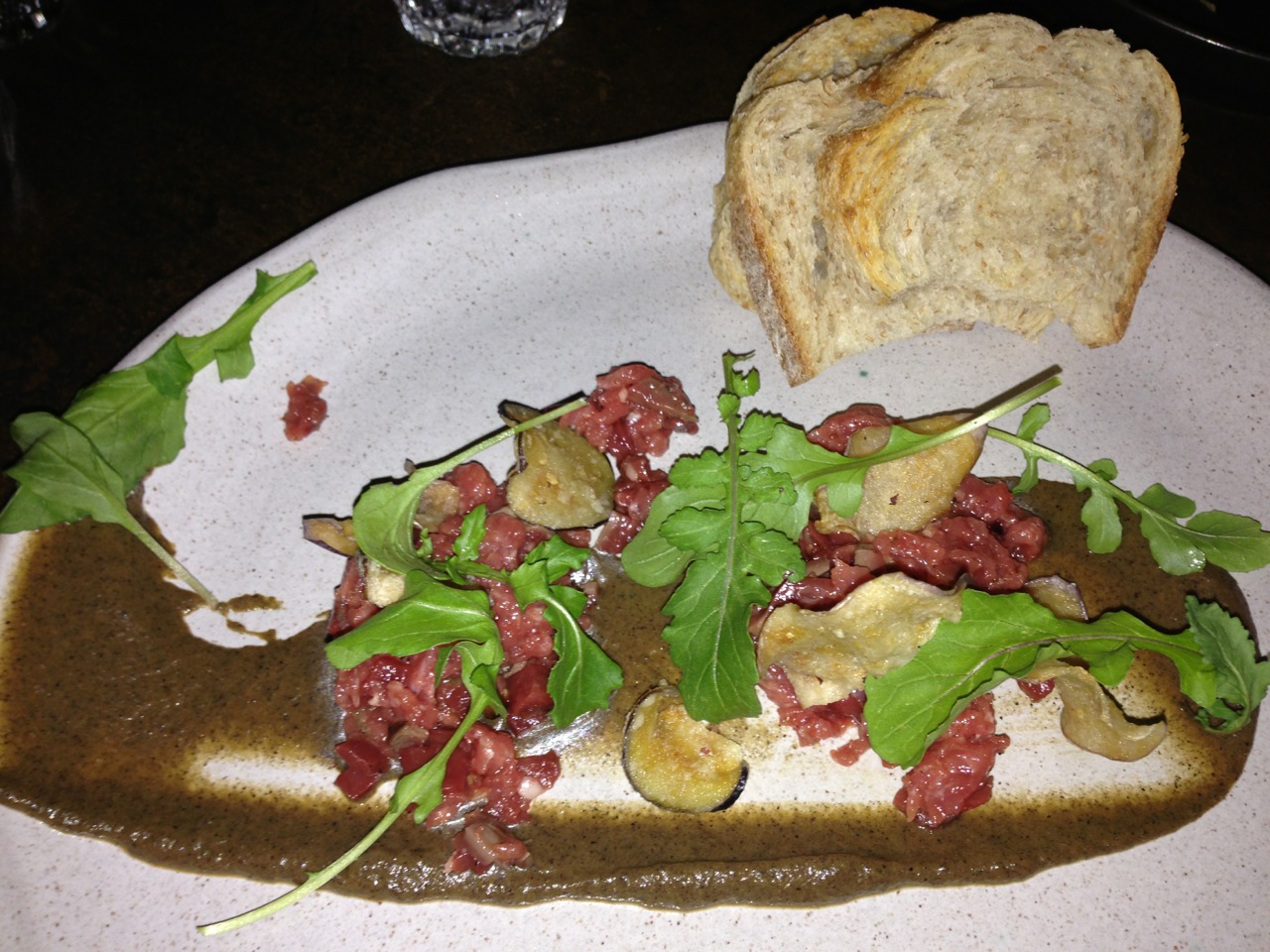 4. Lamb tartare, heritage onions, horseradish emulsion, mustard seed gastrique w/ Pinot Noir-Gamay Noir, Wildebeest 2012 – Okanagan Valley, BC