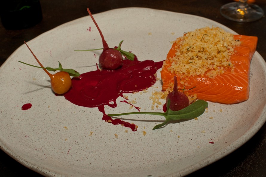 2. Cured and confit Lois Lake trout, pine-scented celeriac, wild & cultivated cress, pine butter w/ Chardonnay, Kumeu River ‘Village’ 2009 – Auckland, NZ